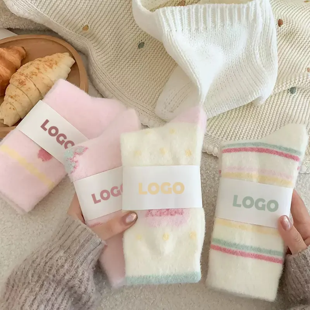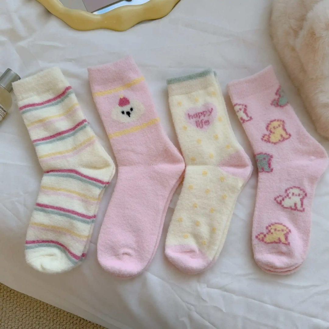 3 pairs Pink Thickened Warm Mid-calf Plush Socks Women's Autumn Winter Home Floor Slippers Striped Cartoon Design Cute Cozy Woolen Socks